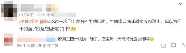 有网友认为,和府捞面的此番操作与店内“熬汤”“炒浇头”等宣传语形成鲜明对比,“以为四十的面能是店里炖的牛排”。