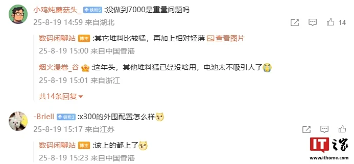 博主在评论区回复了部分网友的问题:针对新机电池没做到 7000mAh 是否是因为重量问题,他回复称“其它堆料比较猛,再加上相对轻薄”;针对 X300 系列新机的外围配置如何,博主表示“该上的都上了
