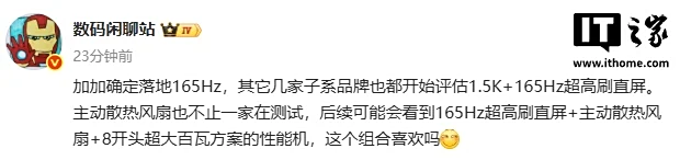 此外,该博主还爆料称,主动散热风扇也不止一家在测试,后续可能会看到 165Hz 超高刷直屏 + 主动散热风扇 + 8 开头超大百瓦方案的性能机。