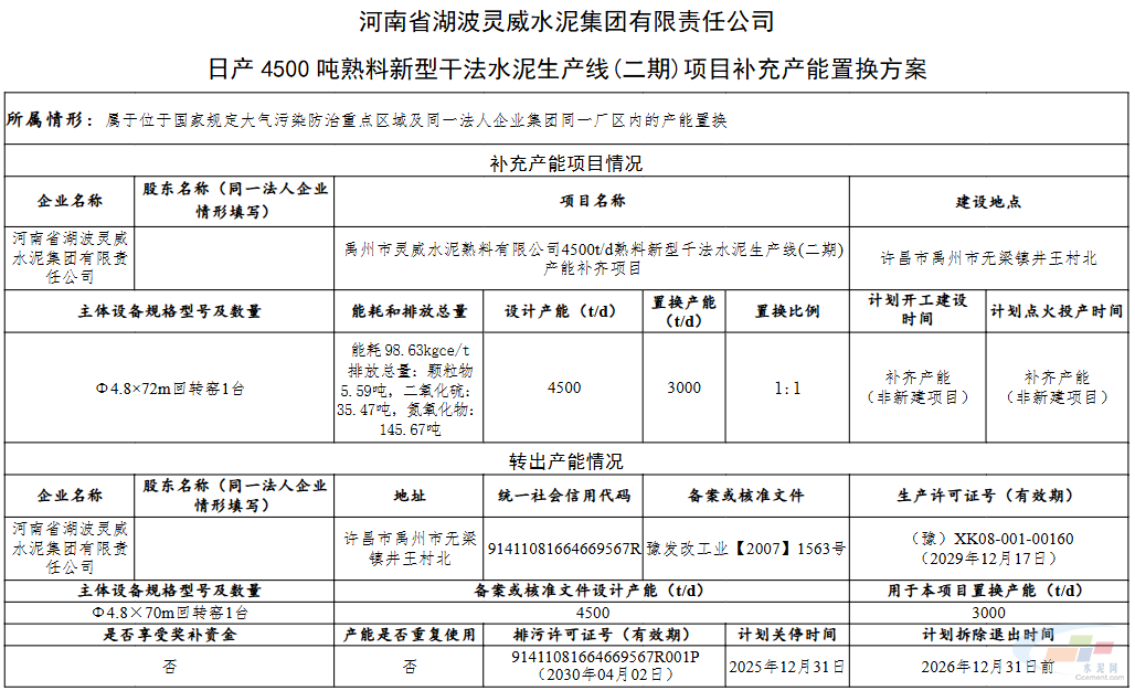 近日,河南省许昌市工信局发布“河南省湖波灵威水泥集团有限责任公司日产4500吨熟料新型干法水泥生产线(二期)项目补充产能置换方案、河南省湖波灵威水泥集团有限责任公司日产4500吨新型干法水泥熟料生产线(一期)产能置换方案的公示”。