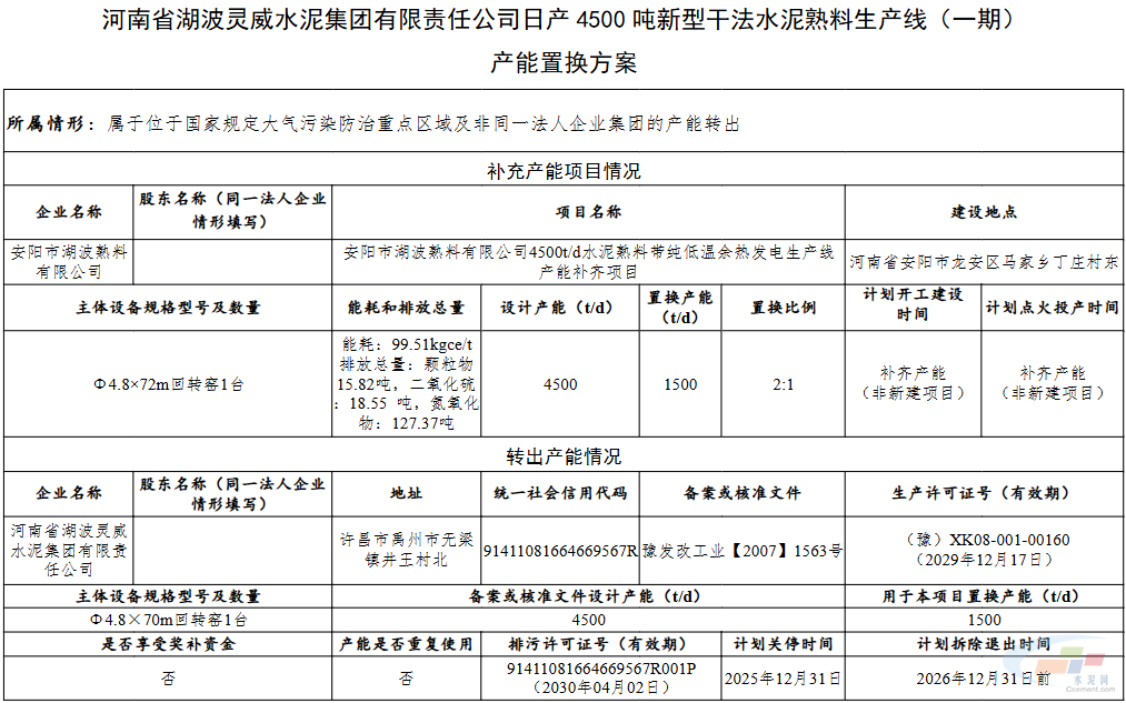 剩余1500t/d产能用于补充安阳市湖波熟料公司一条4500t/d熟料生产线,补充后产能5250t/d,置换比例2:1。